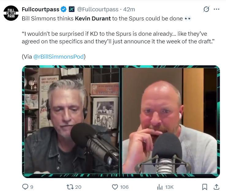 NBA名嘴比爾-西蒙斯在播客節目中透露:我認爲杜蘭特被交易到聖安東尼奧馬刺可能已經完成,兩支球隊在等待官宣了。