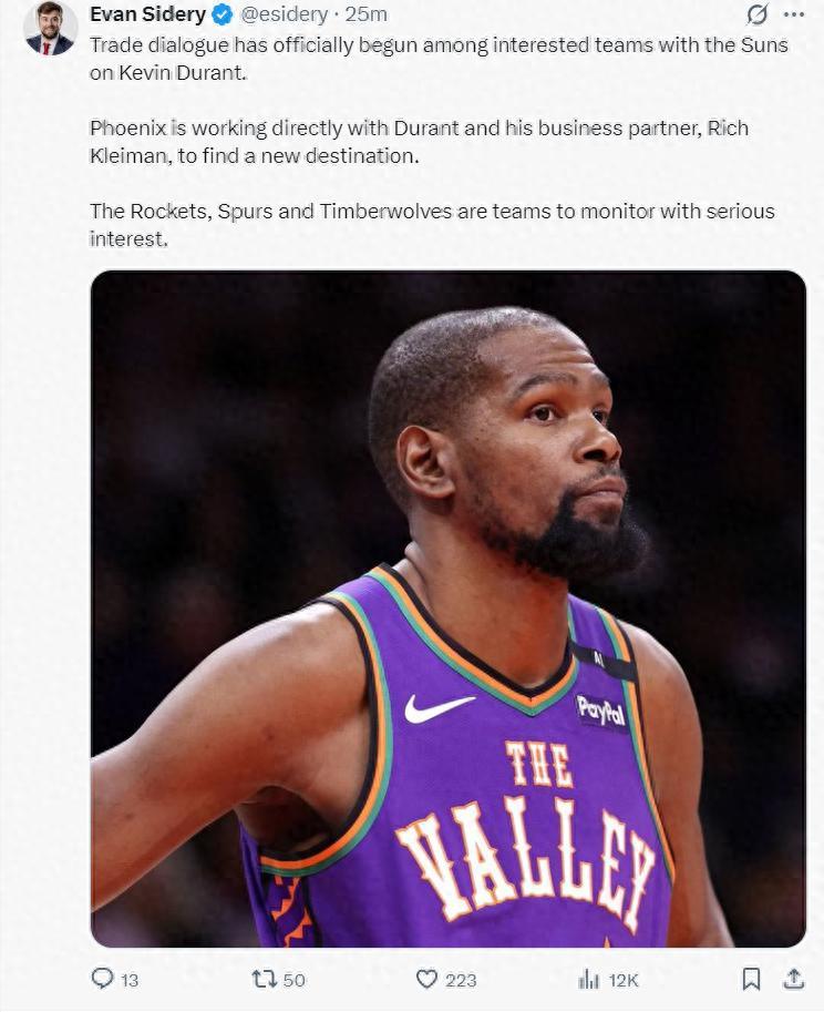 北京時間6月10日凌晨,NBA記者埃文-斯迪瑞報道,菲尼克斯太陽隊已經跟有意凱文-杜蘭特的球隊進行了正式的對話,太陽也與KD經濟公司裏克-克萊曼有過交流雙方尋求KD的下一個落腳點,火箭隊、馬刺隊、森林狼成爲值得關注的球隊。