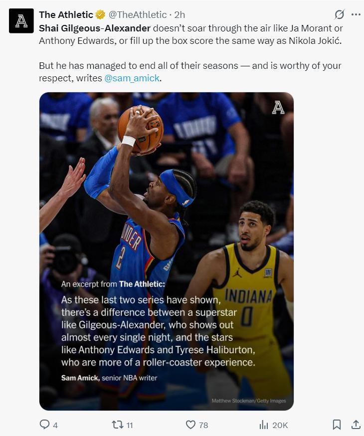 美媒TA寫道:SGA不像莫蘭特與愛德華茲那樣能飛天遁地,也不像約基奇那樣有尺寸可以在籃下輕鬆強打,但他成功的找到終結比賽的方式,他贏得了所有尊重。