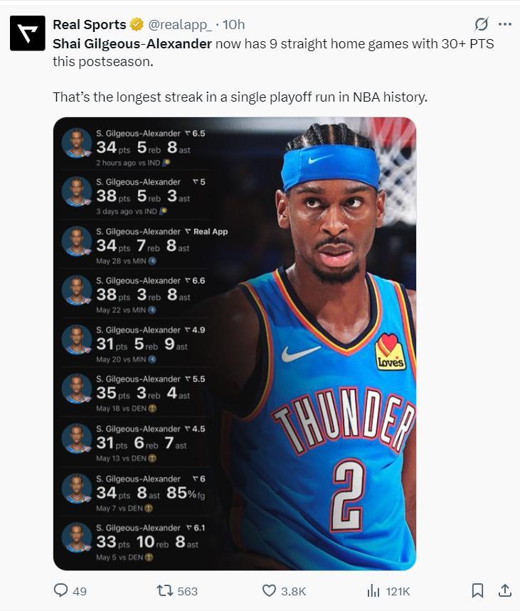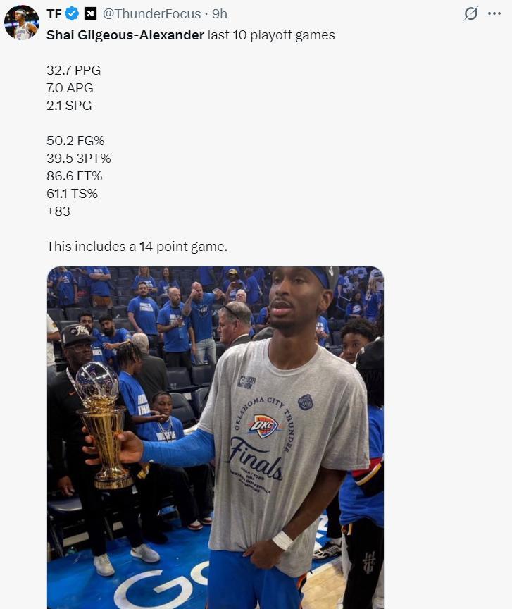 過去的10場季後賽,SGA場均32.7分7助攻2.1搶斷,命中率50.2%,三分命中率39.5%,真實命中率61.1%,正負值+83。