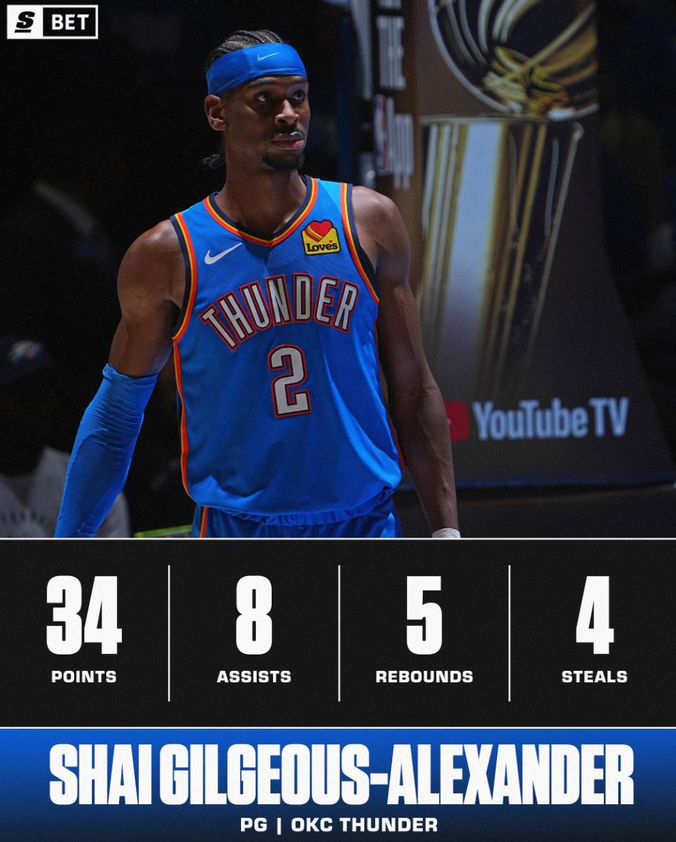 G2一戰,亞歷山大全場比賽36分鐘,21中11,三分4中1,罰球12中11,拿到34分8助攻5籃板4搶斷1蓋帽,命中率52.4%,說他攻防一體不爲過吧?而且SGA還提前了接近4分鐘打卡,不然此役有希望拿40+。