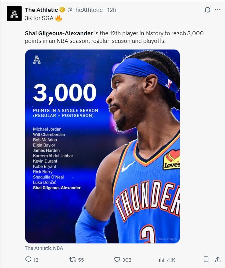 4.SGA常規賽+季後賽單賽季拿3000分以上NBA歷史第12人;
