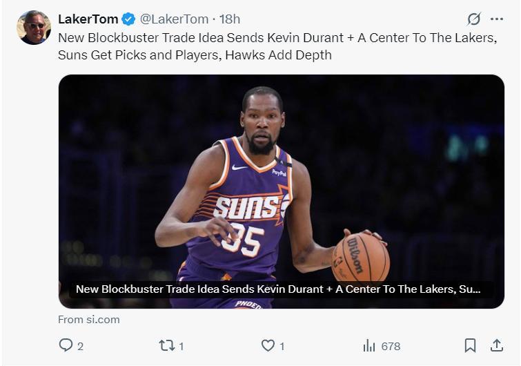 北京時間6月9日,湖人媒體Laker Tom轉發了美媒SI記者傑克遜-考瓦德的一篇推文,考瓦德建議湖人追逐杜蘭特,湖人、太陽將老鷹拉成第三方,這樣就可以建立三方大交易。