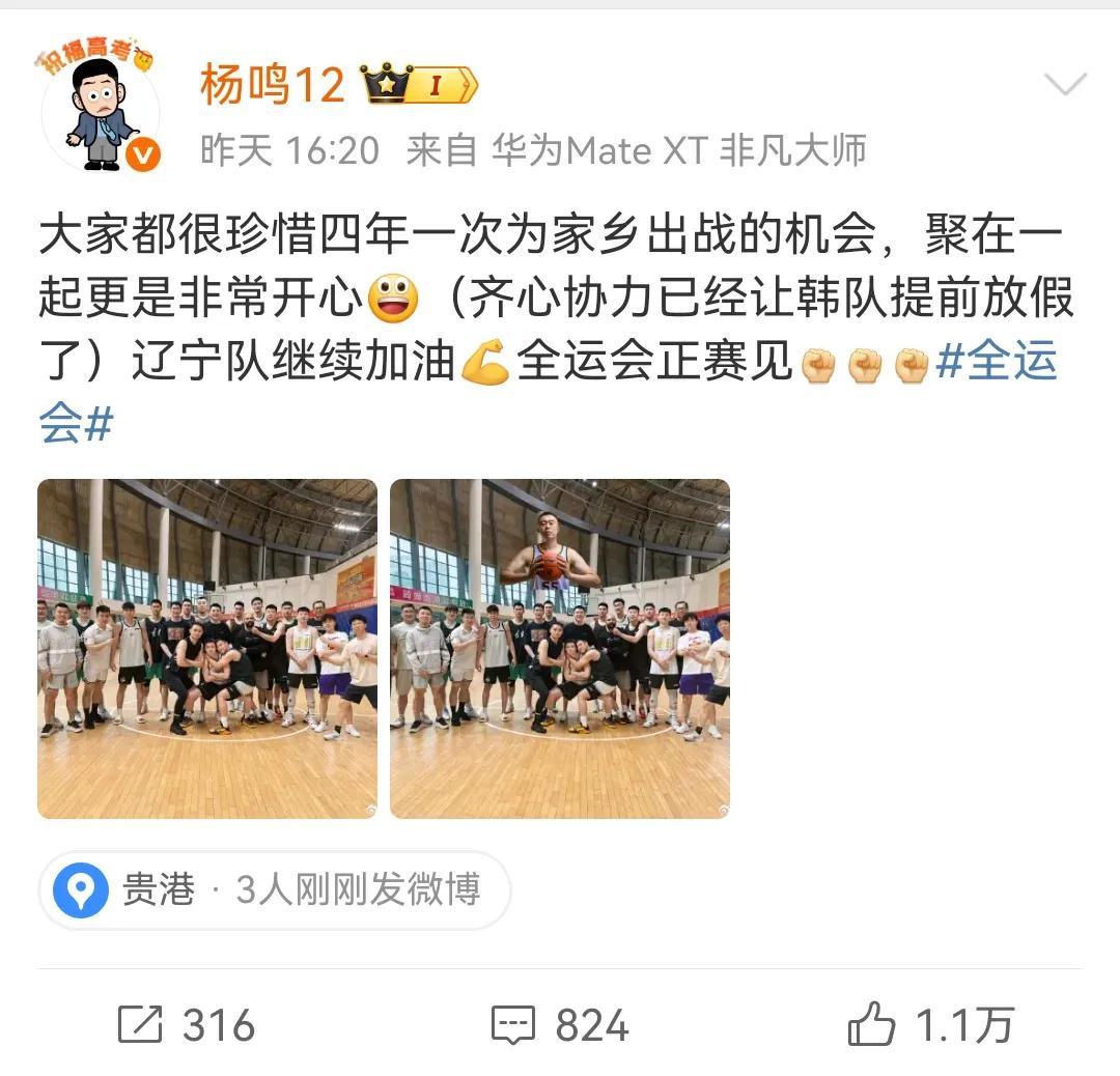 昨天下午,遼寧男籃主教練楊鳴罕見更新個人社交媒體,他曬出了全隊在一起的合影,並附文表示:“大家都很珍惜四年一次爲家鄉出戰的機會,聚在一起更是非常開心。(齊心協力已經讓韓隊提前放假了),遼寧隊繼續加油,全運會正賽見!”