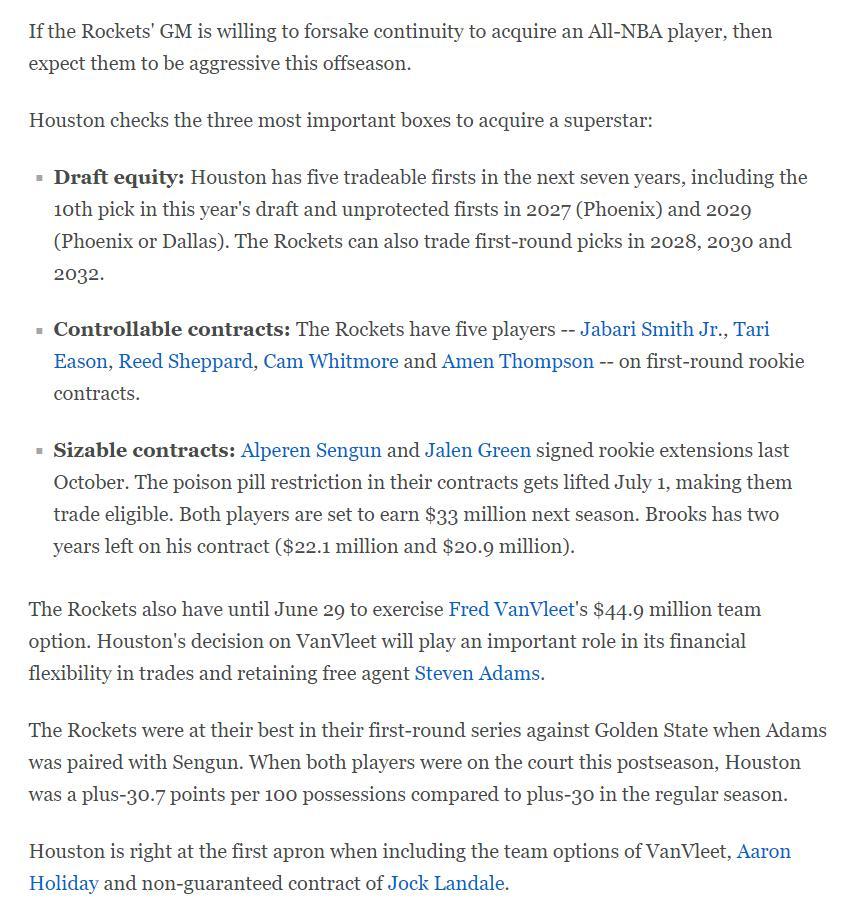 根據ESPN薪資結構專家鮑比-馬克斯的長文分析,如果火箭願意放棄陣容的延續性換來全明星球員那麼下賽季肯定會變得更具侵略性。