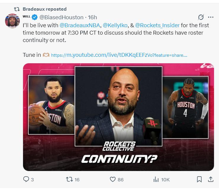因爲拉斐爾-斯通的言論,火箭TA隊記凱利-伊科,知名休媒BradeauxNBA,休城著名播客節目Rockets_Insider將邀請火箭GM拉斐爾-斯通作客直播間爲火箭球迷們一一答疑。