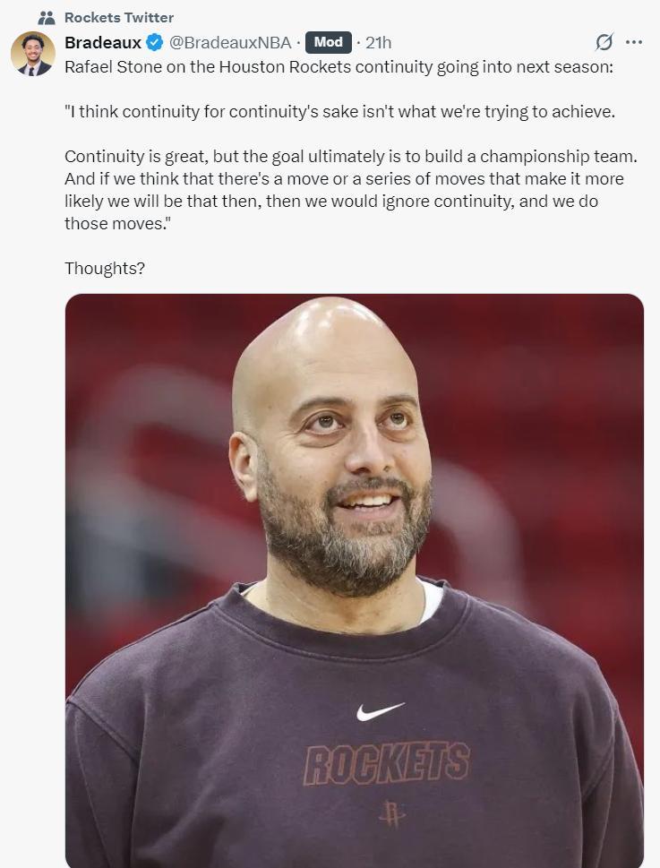 火箭GM拉斐爾-斯通在採訪談到休斯頓火箭隊下個賽季陣容穩定性的看法:“我認爲僅僅是保持陣容的穩定性還不夠,這不是我們想要追求的目標。陣容連續性固然重要,但最終的目標是打造一支總冠軍球隊。如果我們認爲一些運作可以讓我們達到總冠軍目標,那麼我們就可以會拆散陣容,用手裏的資產採取一些行動。”