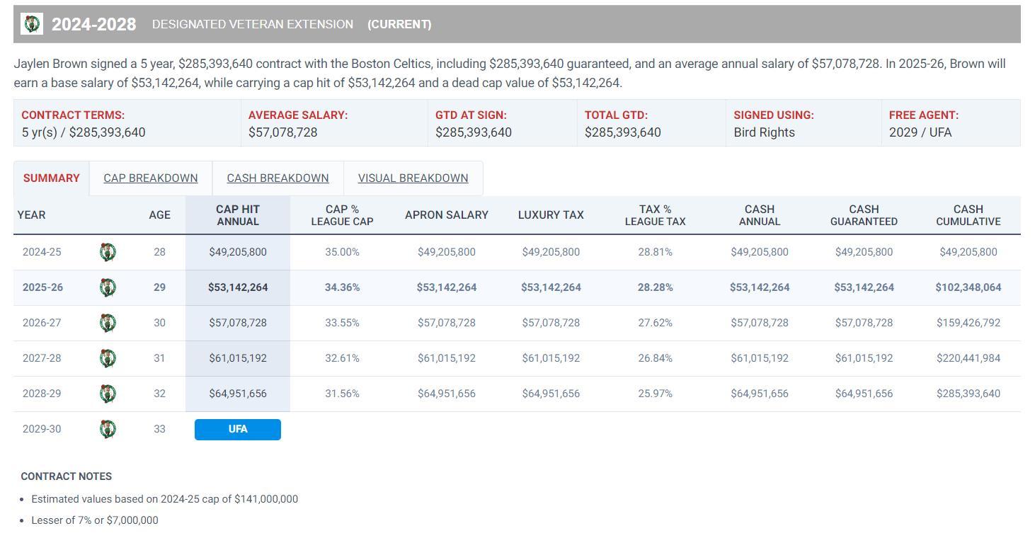 杰倫-布朗五年2.85億的超級 頂薪,25-26賽季纔是第二年價值5314萬,28-29賽季要高達6495萬,這份合同沒有球員選項與球隊選項。