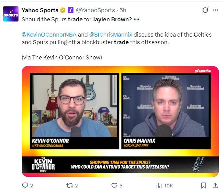 NBA記者凱文-奧康納與SI記者克里斯-曼尼克斯在《雅虎體育》的播客節目中談到凱爾特人與馬刺的一筆潛在交易,奧康納覺得聖安東尼奧馬刺可以交易得到綠凱球星杰倫-布朗,他們認爲這筆交易可以是雙贏的。