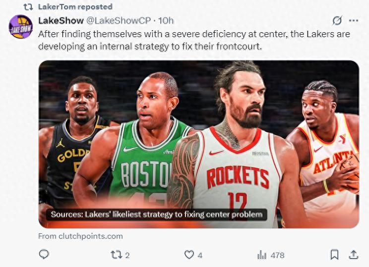 他認爲湖人引進像邁爾斯-特納與納茲-裏德這個級別的中鋒根本不可能,因爲這些人的薪水湖人匹配不上,史蒂文-亞當斯如果願意接受全額中產1410萬湖人是可以籤來他,但他對火箭的情感很深厚,火箭也想留下他,全額中產火箭也可以給。