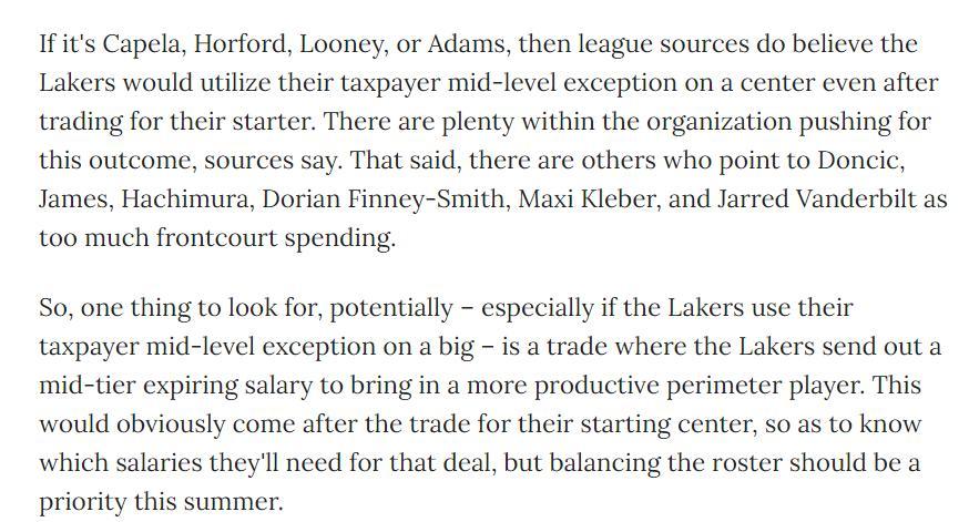 文中還寫道:如果利用570萬的雙年特例就補強了一個先發中鋒,那麼湖人就可以留着全額中產來引進一位更具能力的外線球員,尤其是防守端可以幫助東契奇的外線。