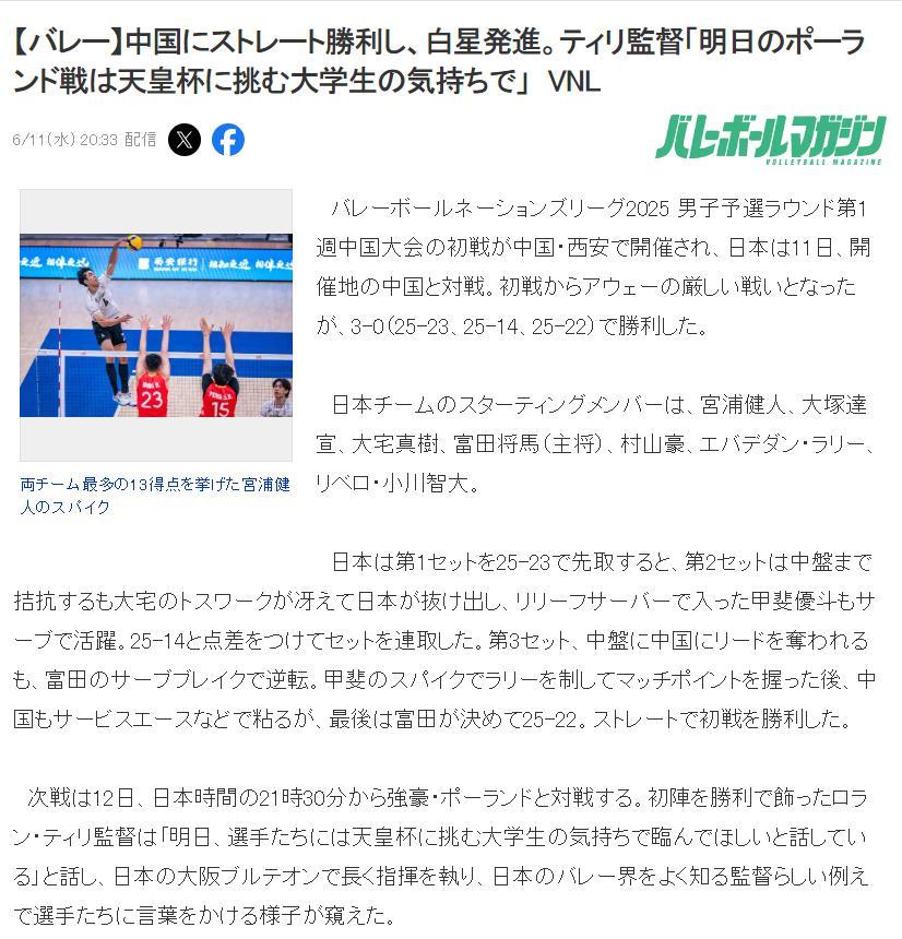 賽後日本媒體發文——在客場擊敗中國隊拿到開門紅,蒂利教練聲稱下一場打強隊波蘭要拿出大學生TH杯的心態來迎戰。
