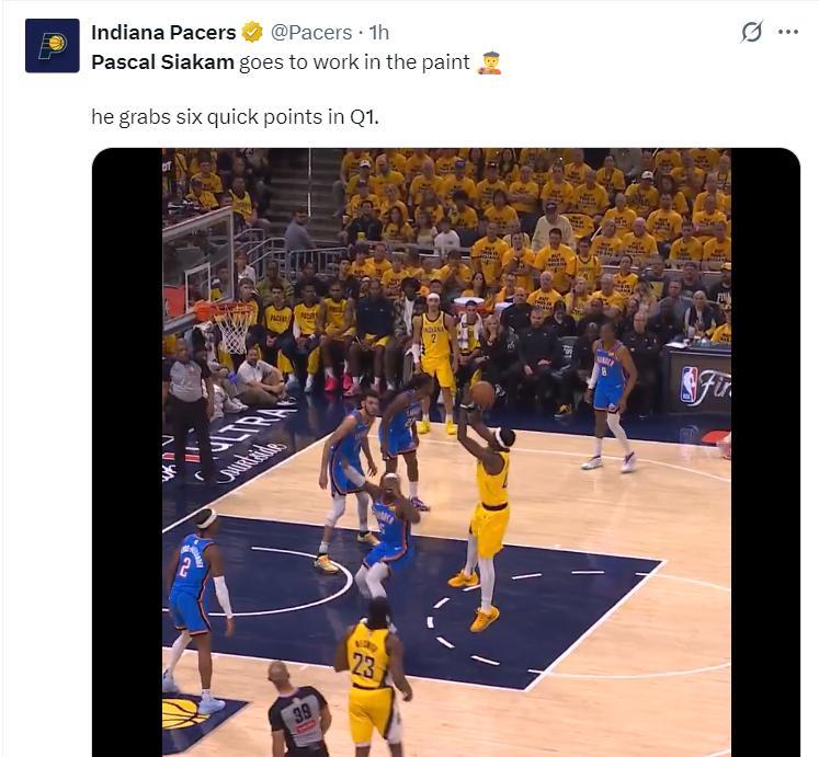 末節,西卡3中2拿到4分1搶斷,他在終場前1分09秒那個籃下單打價值千金,因爲那球幫助步行者再度建立8分的領先,雷霆的防守陣型完全被打散了。全場比賽西卡32分鐘,14中8,罰球6中5拿到21分6籃板4助攻2搶斷1蓋帽0失誤,他也拿到總決賽第一場20+。