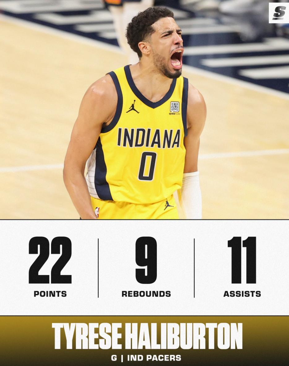 全場比賽哈利伯頓36分鐘,17中9,三分8中4,0罰球拿到22分11助攻9籃板2搶斷1蓋帽4失誤,命中率52.9%,三分命中率50%。