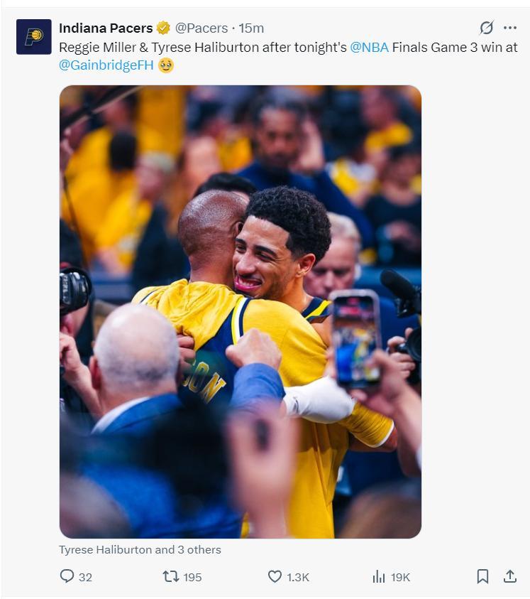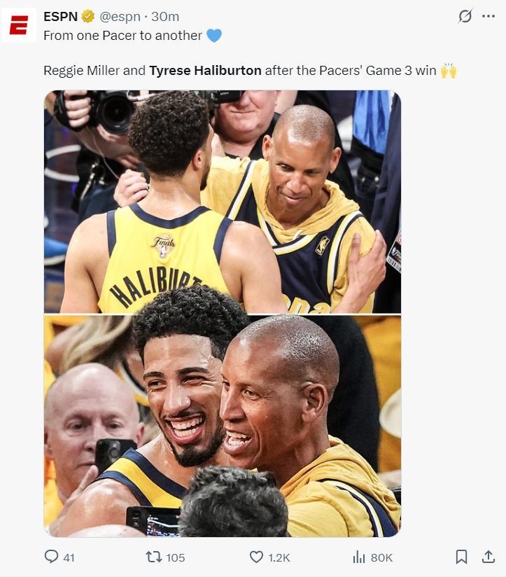 賽後哈利伯頓與步行者名宿米勒緊緊相擁,兩人都十分開心。