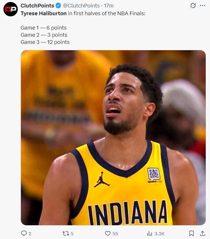 首節哈利伯頓還是不溫不火只拿到5分而已,但第二節哈利伯頓7分鐘裏5中3+三分2中1拿到7分2籃板3助攻,美媒曬出他總決賽前三場上半場:第一場6分、第二場3分、第三場12分。這是哈利伯頓總決賽上半場新高得分。
