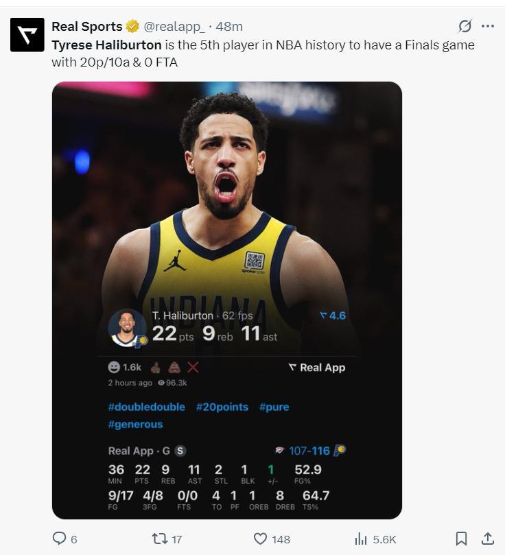 哈利伯頓也成爲NBA歷史上第五位在總決賽拿到至少20分+10助攻+0罰球的球員。
