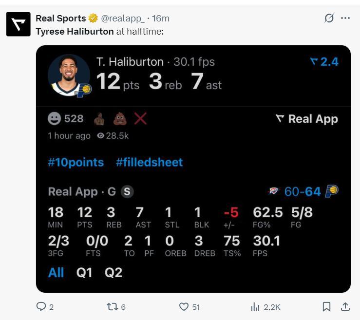 而且哈利伯頓上半場18分鐘,8中5+三分3中2,拿到12分3籃板7助攻1搶斷1蓋帽2失誤,命中率62.5%,哈利伯頓效率也很高,不過他在場時步行者-5分。