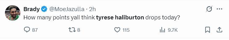 比賽還沒開場,塔圖姆球迷就詢問步行者球迷 :你們覺得這場比賽泰雷斯-哈利伯頓能拿幾分?(之前的兩場比賽一場14分,一場17分)