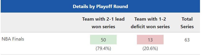 NBA歷史上總決賽2-1領先的球隊是50勝13負,換言之有79.4%的概率拿下總冠軍。