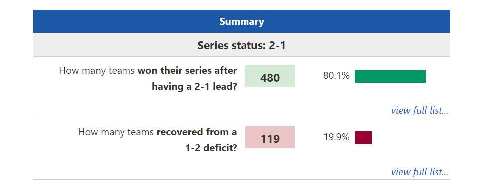 NBA歷史上季後賽2-1領先的球隊,是480勝119負,也就是80.1%的晉級概率。