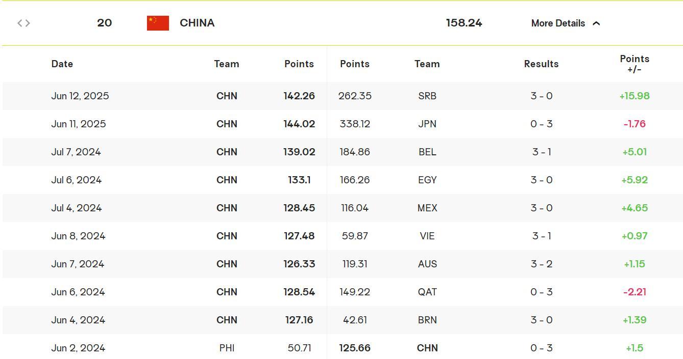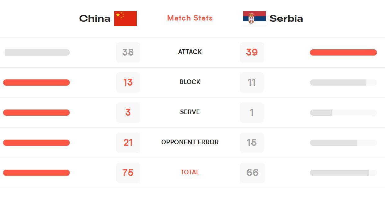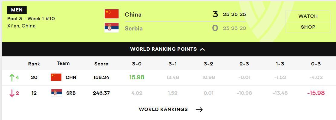 這場比賽中國男排喜提15.98分,塞爾維亞男排則-15.98分,中國男排從世界第24位升至世界第20,而塞爾維亞男排從世界第十下滑到世界排名第12。