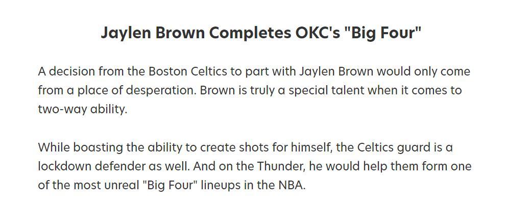 在Shams透露綠凱會聽取杰倫-布朗、德里克-懷特報價後,雅虎體育記者克里斯-海恩斯透露綠凱希望從布朗的交易中換回4個首輪籤。