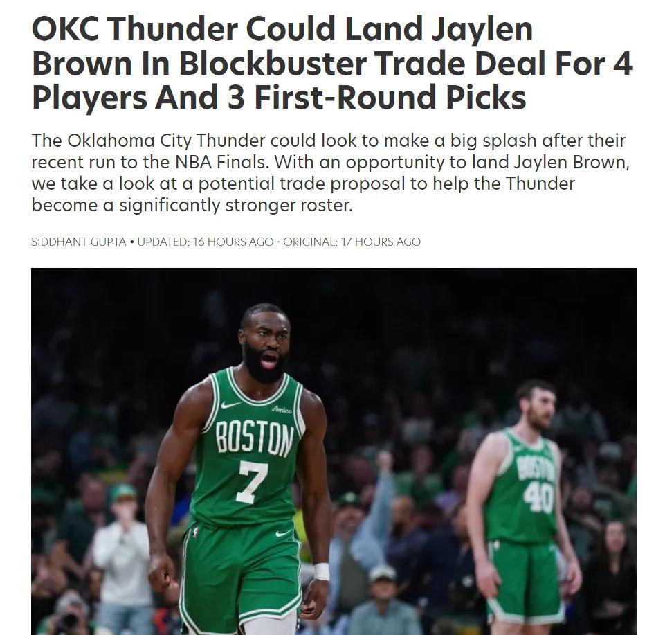 雷霆VS步行者的總決賽還沒結束,北京時間6月13日美媒FW記者悉達多-古普塔建議雷霆隊在今夏引進杰倫-布朗,因爲綠凱爲了減輕高額奢侈稅負擔只要籌碼足夠就可以完成這筆交易,雷霆則可以組建一套更爲強悍的陣容,雷霆的關鍵球能力也可以解決。