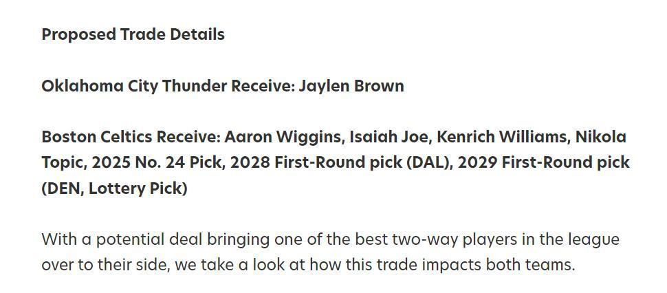 這筆交易方案,雷霆送出4個年輕資產與3個首輪籤,這樣的籌碼足以打動綠凱管理層,具體方案——雷霆送出阿龍-威金斯、以賽亞-喬、肯德里克-威廉森、尼古拉-託皮奇、2025年25號籤、2028年獨行俠首輪、2029年掘金無保護首輪籤。(託皮奇這樣的天才選手價值實際上是超過1個首輪籤的)