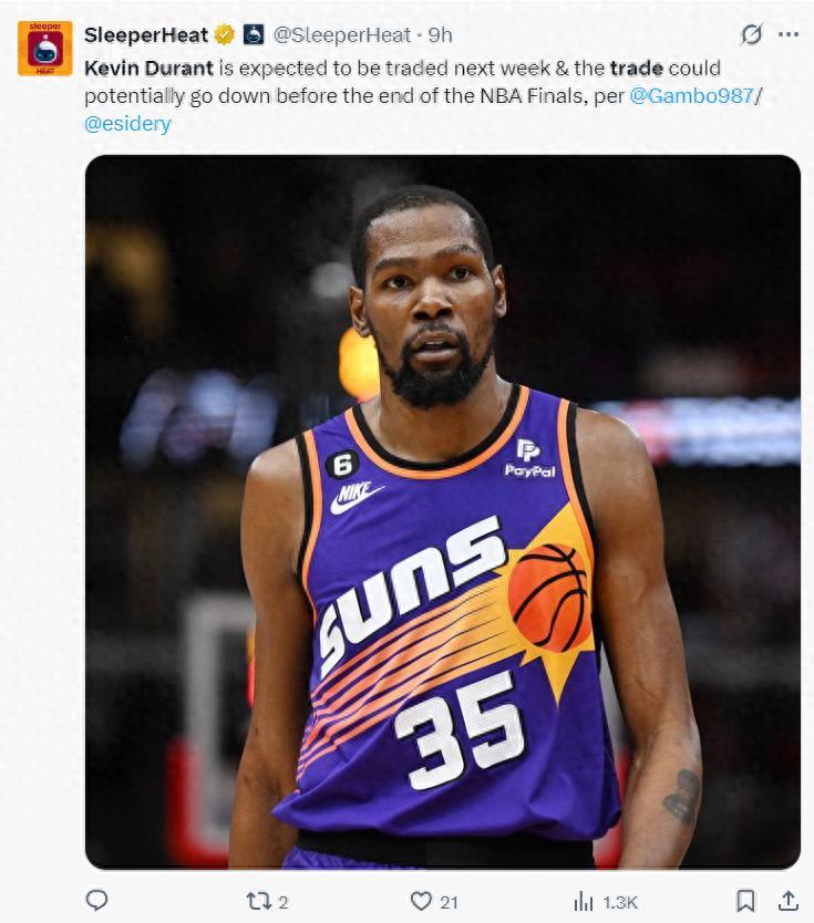 北京時間6月13日,太陽隊記Gambo透露,凱文-杜蘭特最快下週就會被交易。一石激起千層浪,隨後多個消息源透露:火箭、馬刺、快船、尼克斯、森林狼、熱火等都對杜蘭特有意。最終KD的下家是誰很難預測,不過太陽管理層肯定希望利益最大化。