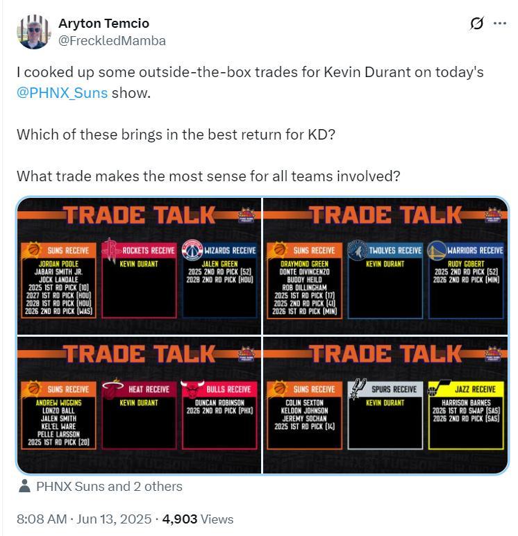 北京時間6月13日,據Draftstack的記者Aryton Temcio報道模擬了杜蘭特最可能加盟的四支球隊——火箭、森林狼、熱火、馬刺,他進行了四筆交易模擬,這四筆交易模擬都是三方交易,他還詢問球迷覺得哪一筆太陽利益最佳,哪筆交易最具意義?