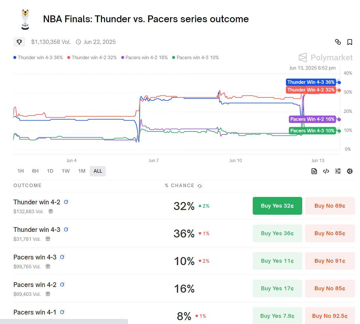 美媒Polymarket認爲雷霆奪冠概率還有68%,步行者只有32%。大家覺得呢?
