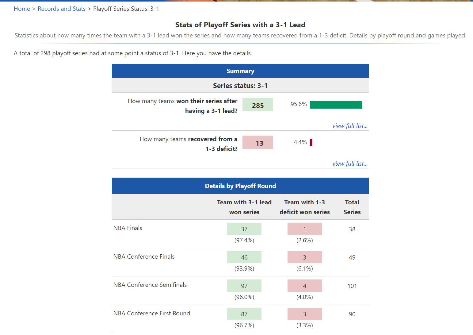 如果步行者能贏下總決賽G4,那麼步行者就是3-1領先,從歷史來看是285勝13負,奪冠概率就高達95.6%,雷霆就只剩下4.4%的逆襲概率。總決賽3-1領先的球隊是37勝1負,奪冠概率高達97.4%,只有16年的騎士隊完成過逆襲。