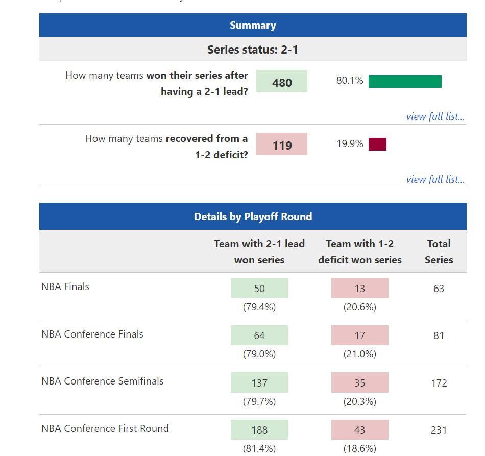 步行者2-1領先,根據NBA歷史來看,480勝119負,晉級概率是80.1%,從歷史來看步行者的奪冠概率更高。
