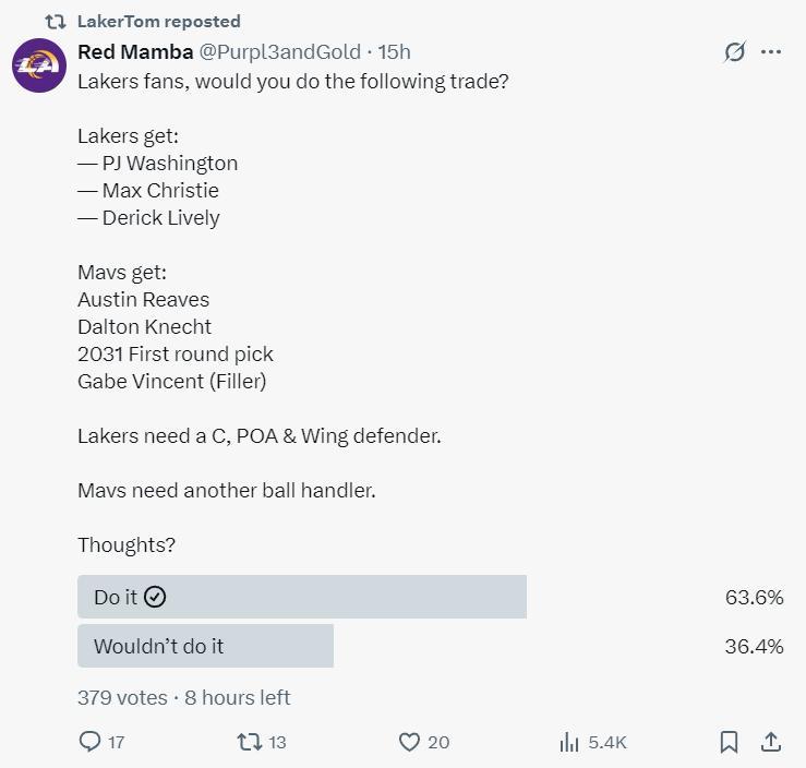 北京時間6月13日,湖人媒體RedMamba建議湖人與獨行俠再度交易,他還詢問了湖人球迷是否願意跟獨行俠做這筆交易。(來源也是約什-布哈所說佩林卡喜歡跟固定的夥伴進行交易)有63.6%的球迷覺得這筆交易可以做,有36.4%的球迷覺得不該做這筆交易。