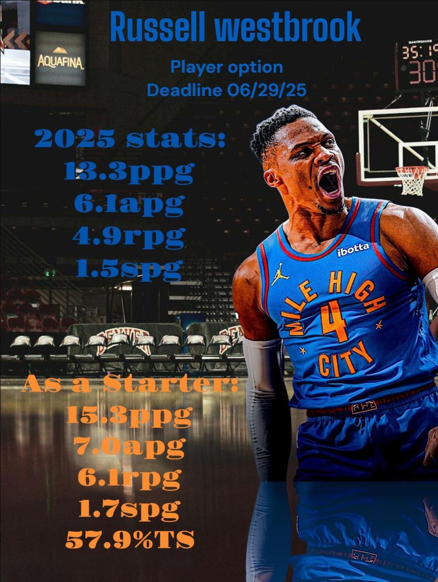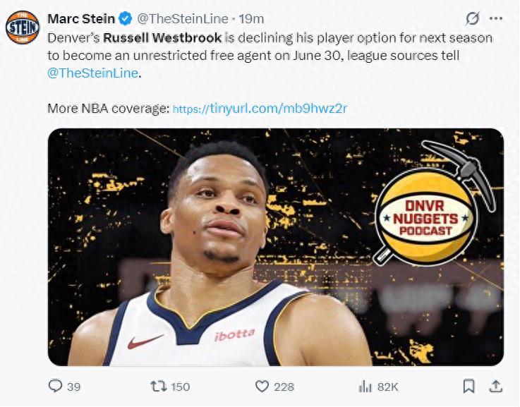 北京時間6月13日,NBA記者馬克-斯坦恩透露,掘金後衛拉塞爾-威斯布魯克拒絕執行賽季340萬的球員選項,他將在7月1日成爲完全自由球員涉水自由市場。