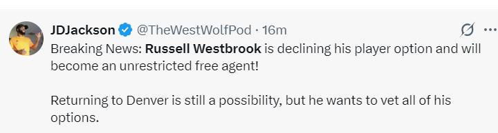 美記JD傑克遜透露:拉塞爾-威斯布魯克依舊存在重返丹佛掘金的可能性,掘金只是他的一個選擇。