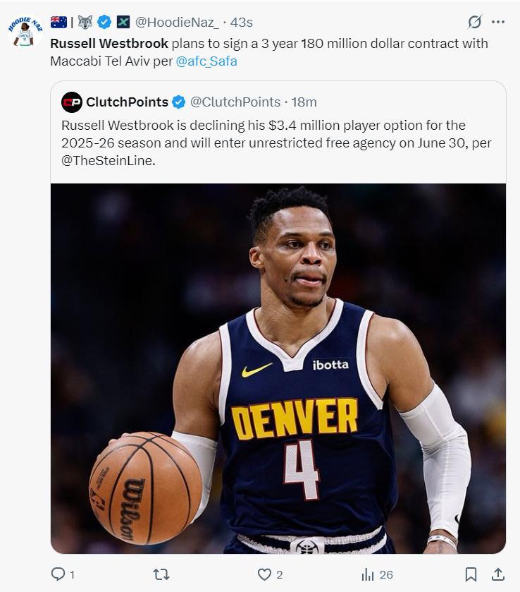 森林狼球迷調侃:威少拒絕執行球員選項後,他會以3年1.8億加盟特拉維夫馬卡比隊。(根據此前的報道,特拉維夫馬卡比願意給威少一份歐洲歷史最大的合同),不過威少並沒有回應,他似乎還是更願意留在NBA打球。