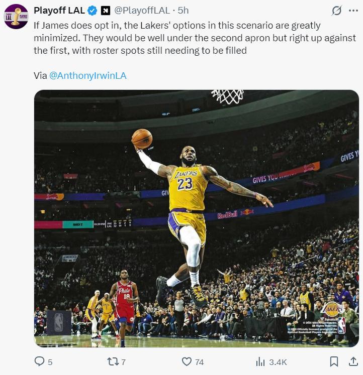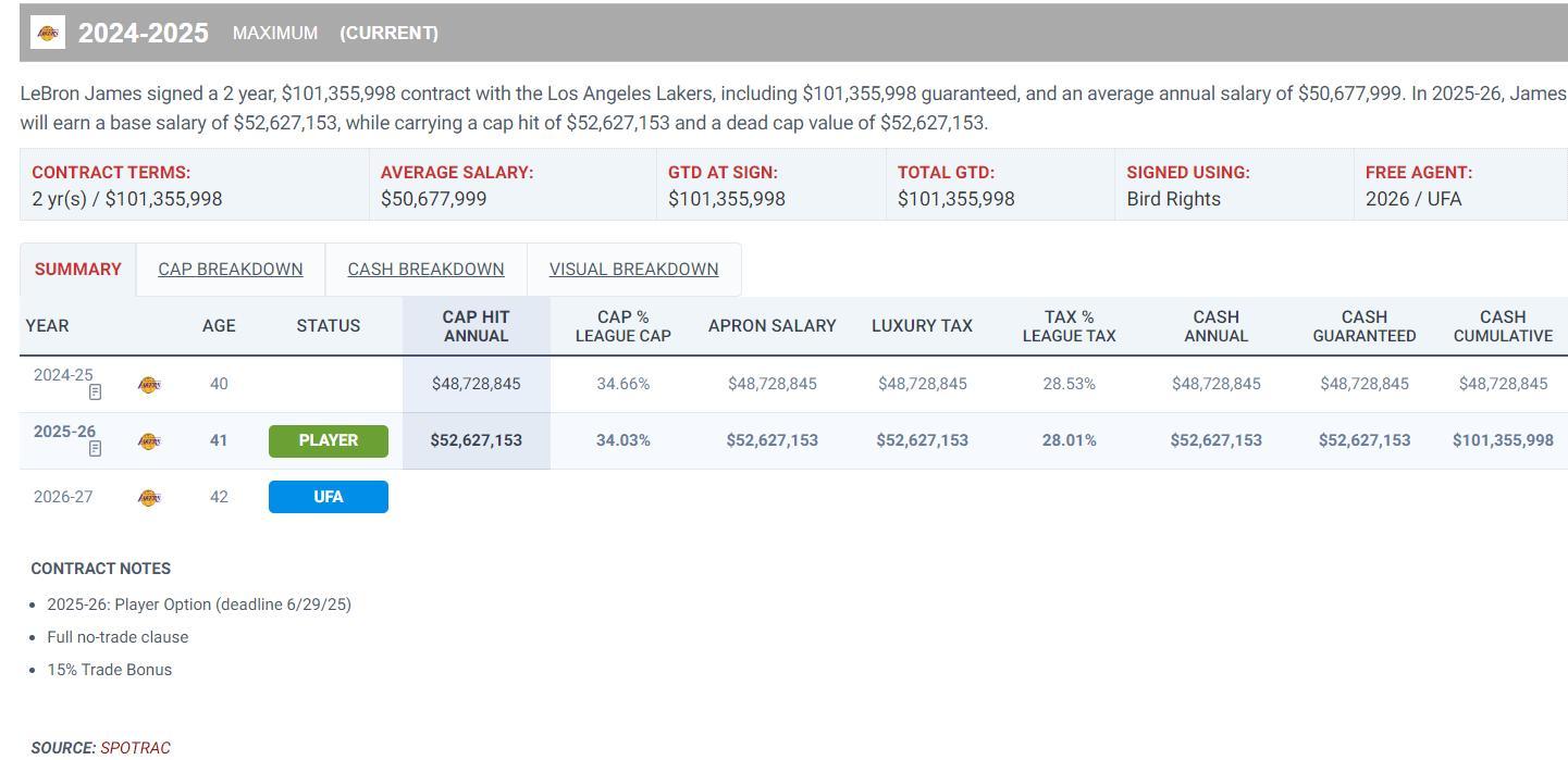 下賽季勒布朗的球員選項是5262萬,如果重籤新合同必然也是均薪超過5000萬的超大合同。