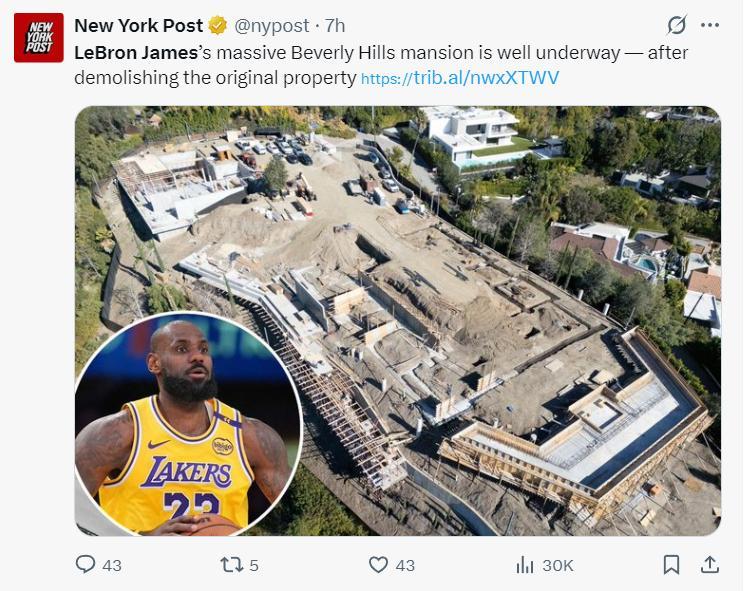 北京時間6月14日,美媒New York Post爆料,湖人球星勒布朗-詹姆斯在比弗利山莊的豪宅重建已經初見雛形,這座佔地13000平方英尺的超級豪宅框架已經搭載完成,而且旁邊已經建起了能居住的小型別墅。