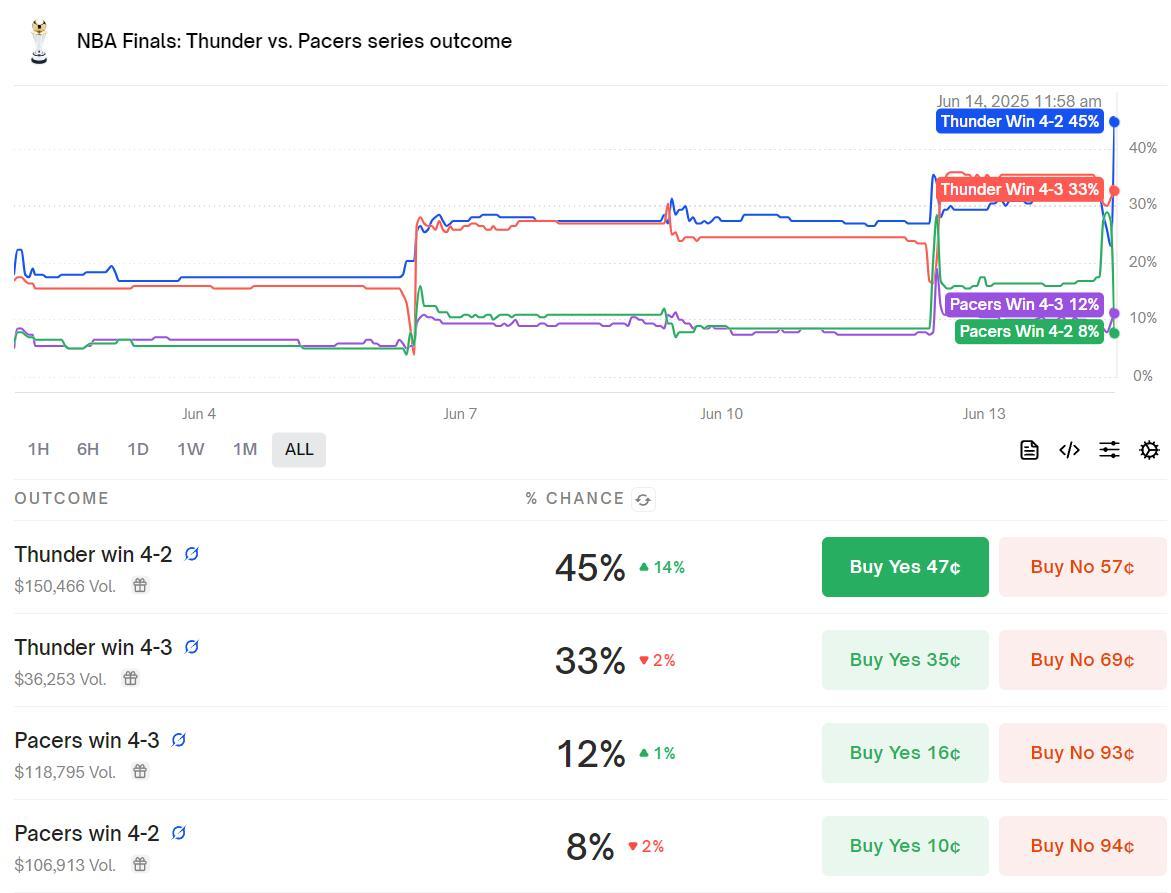 美媒Polymark認爲雷霆已經有78%的奪冠概率,步行者只剩下22%。
