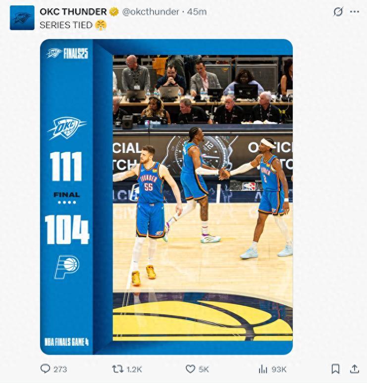 北京時間6月14日,總決賽G4,雷霆以111-104擊敗步行者,大比分扳成2-2。雷霆此役一度落後步行者達到10分之多,最終雷霆在末節實現了逆轉,這也是總決賽第一次雷霆完成的逆轉,雷霆拿下這場關鍵的G4後進入天王山。