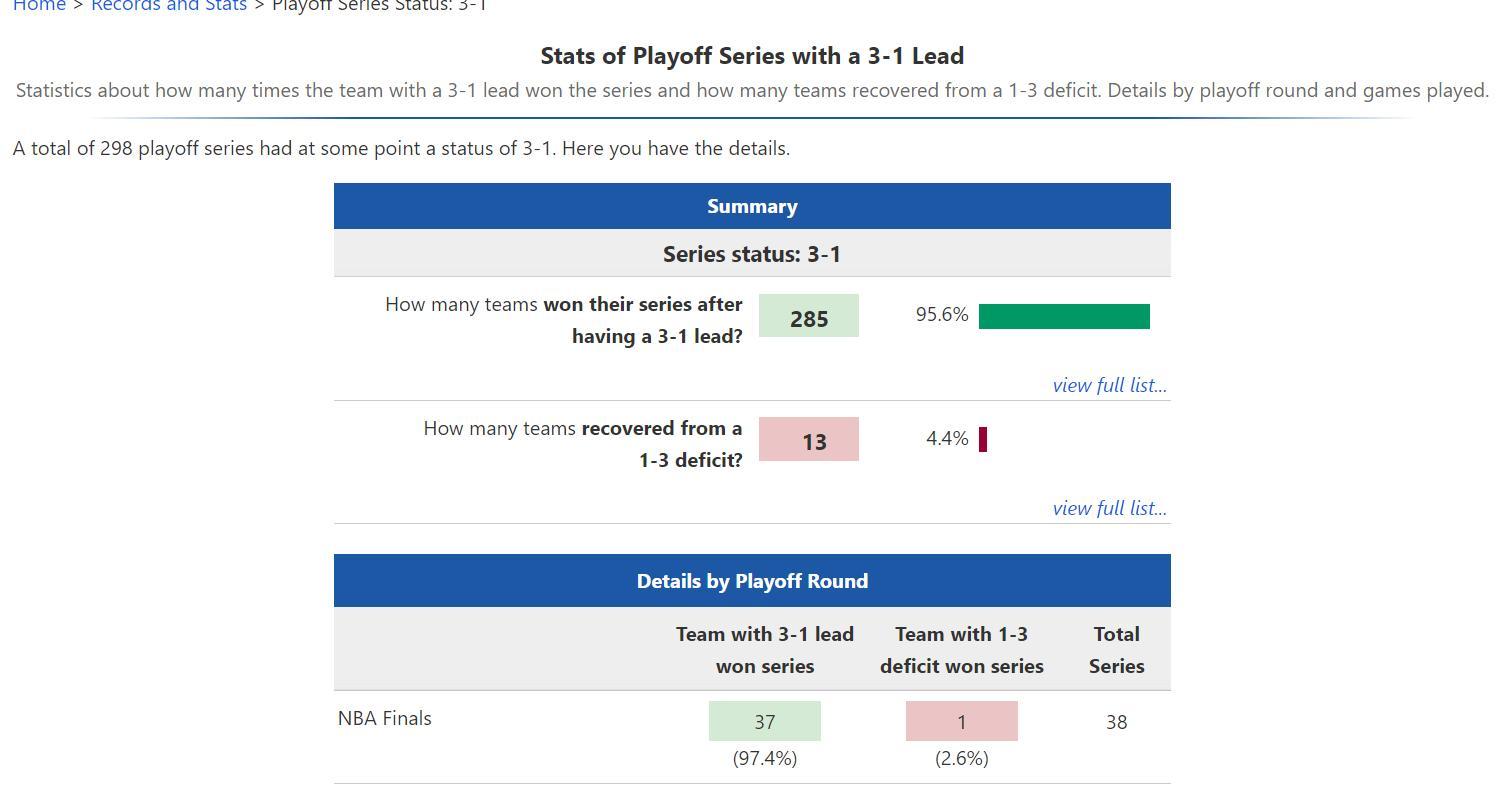 值得一提的是雷霆贏下G4,避免1-3落後,因爲NBA歷史1-3落後的球隊只有4.4%能完成逆轉。
