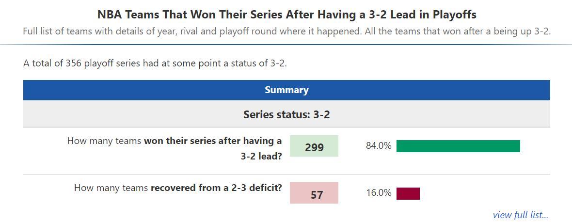 天王山之戰是關鍵,NBA歷史來看拿到天王山之戰贏球的球隊有84%的概率贏下系列賽,戰績是299勝57負,只有16%的球隊可以完成逆襲。