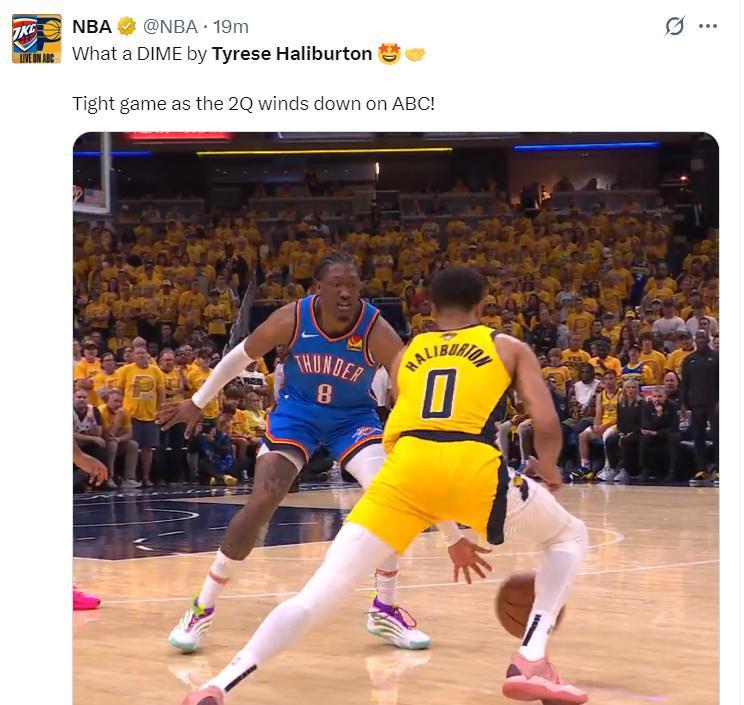 次節前半段哈利伯頓就是一個看客的角色,他在上半場進入最後1分鐘纔開始進攻,一次空中拉桿晃過了SGA,一次突破完成2+1,他完成今年季後賽第一次罰球,連拿5分後上半場他6中3拿到8分1籃板5助攻1搶斷3失誤。
