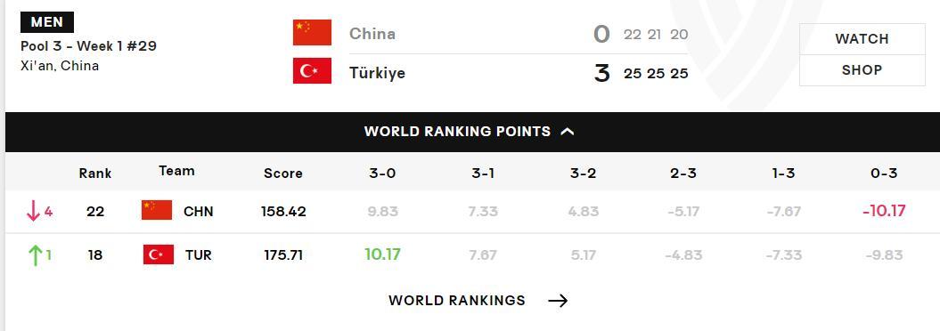 這場比賽中國男排-10.17分,世界排名直接從第18位下滑到第22位,而土耳其男排從世界第19位提升到第18。