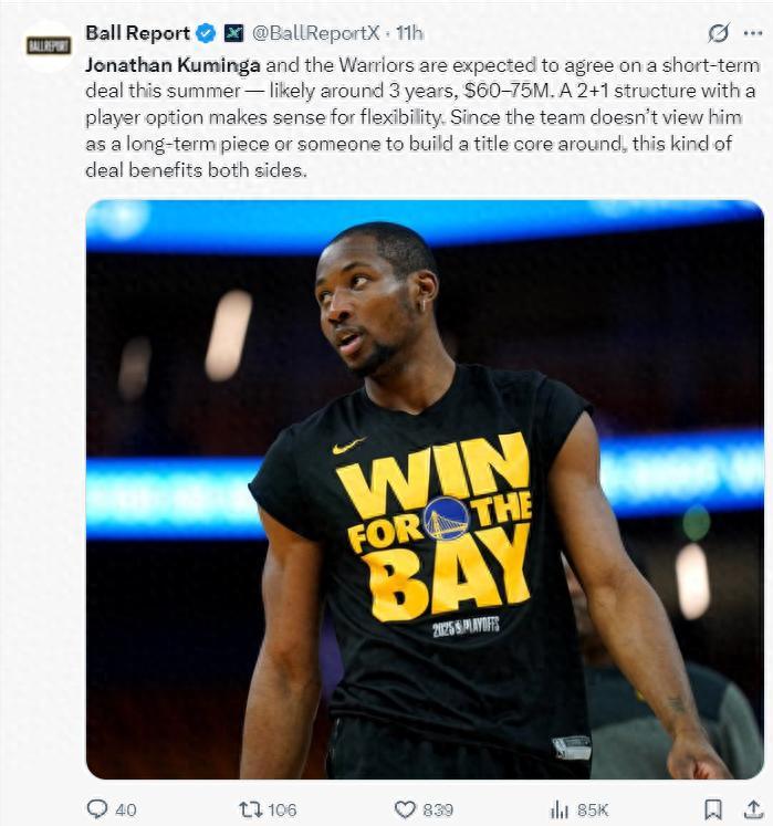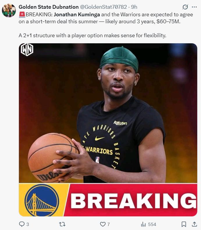 北京時間6月15日,勇士媒體BR透露,喬納森-庫明加與勇士有望在今夏達成一份短期合同,這份合同可能是三年加之6000萬-7500萬,這份合同是2+1帶有球員選項的靈活性合同,由於管理層也覺得庫明加不是一個長期的核心人物,這樣的續約對雙方都有利。