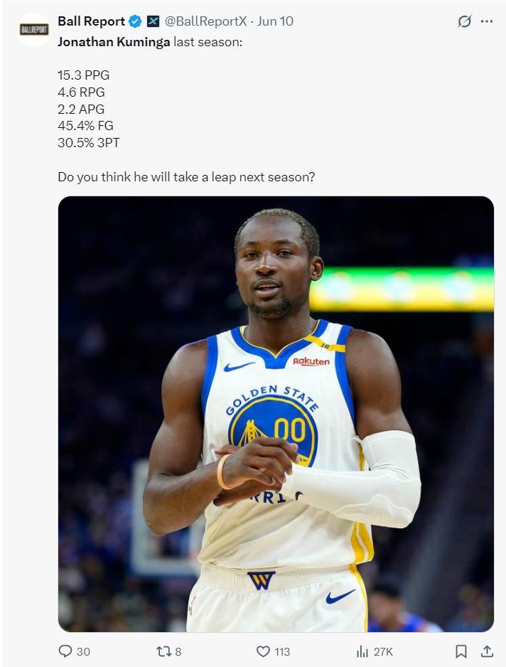 季後賽場均15.2分2.5籃板1.2助攻0.5搶斷0.5蓋帽,命中率48.4%,三分命中率40%,庫明加在庫裏受傷後的表現可圈可點,隊記也透露庫明加今夏大概率會留隊。