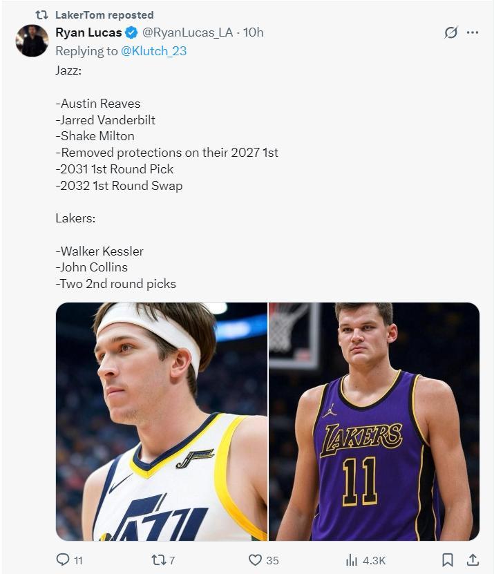 爵士得到:裏夫斯、範德比爾特、米爾頓、湖人2031年首輪、湖人2031年首輪互換權。