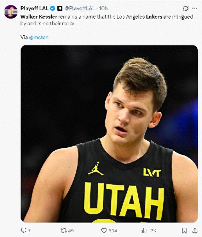 北京時間6月15日,根據馬克-斯坦恩的報道,爵士隊中鋒沃克-凱斯勒一直都是洛杉磯湖人隊引進的目標。